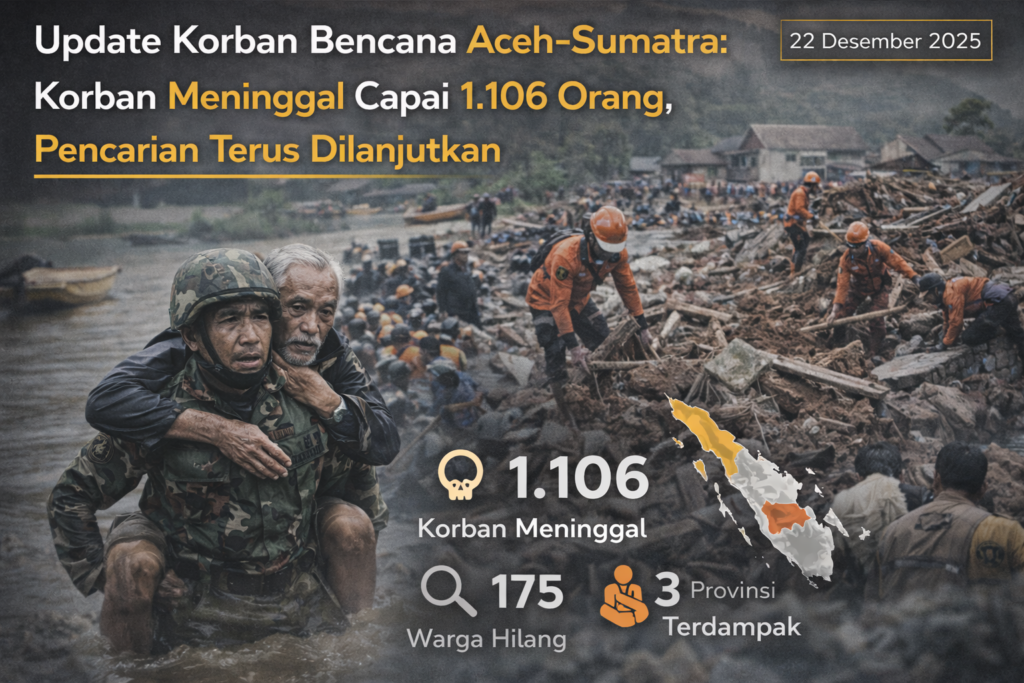 Jakarta — Jumlah korban akibat bencana banjir dan tanah longsor yang melanda Aceh, Sumatera Utara, dan Sumatera Barat terus bertambah hingga Senin (22/12/2025). Berdasarkan data terbaru dari Badan Nasional Penanggulangan Bencana (BNPB), total korban meninggal dunia tercatat mencapai 1.106 orang, meningkat dibandingkan akhir pekan lalu. Sementara itu, 175 warga masih dinyatakan hilang dan dalam proses pencarian oleh tim SAR gabungan.