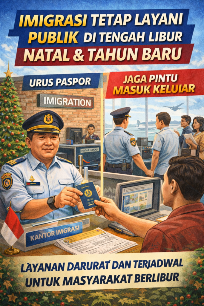 Jakarta, 24 Desember 2025 — Direktorat Jenderal Imigrasi memastikan layanan keimigrasian tetap dapat diakses masyarakat selama periode libur Natal 2025 dan Tahun Baru 2026 (Nataru). Kebijakan ini diambil untuk menjamin kebutuhan administrasi warga tetap terpenuhi meskipun sebagian besar instansi memasuki masa libur nasional.
