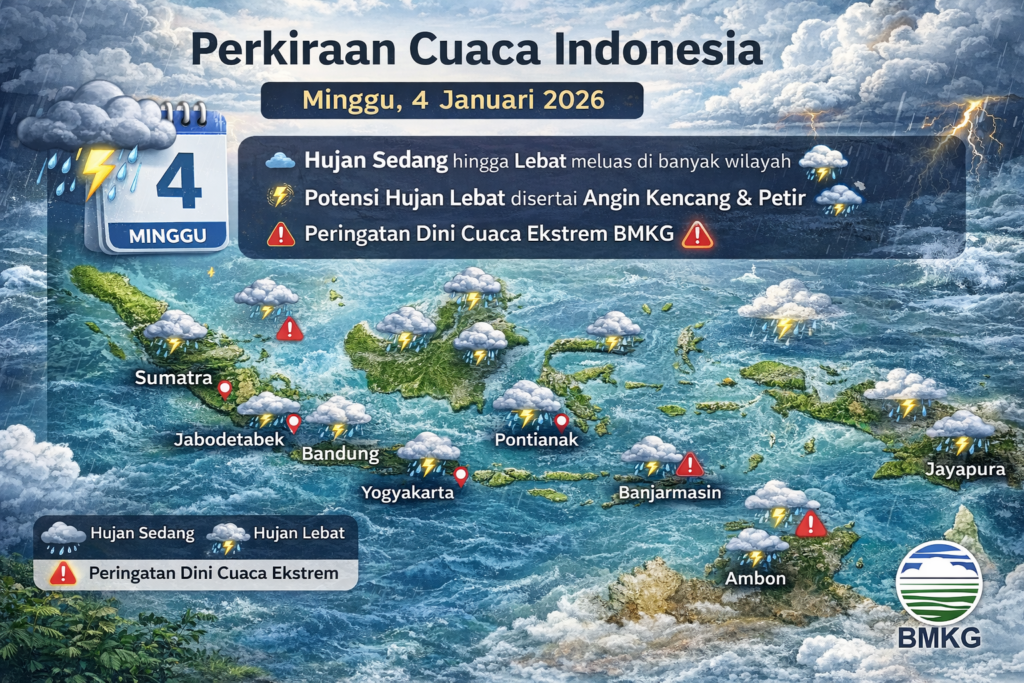 BMKG memprakirakan cuaca berpotensi hujan dengan intensitas sedang hingga lebat di banyak wilayah Indonesia pada Minggu, 4 Januari 2026. Beberapa daerah bahkan berisiko mengalami hujan sangat lebat, disertai angin kencang dan petir seiring adanya gangguan atmosfer yang masih aktif.